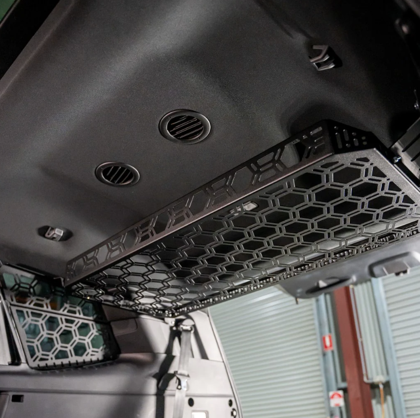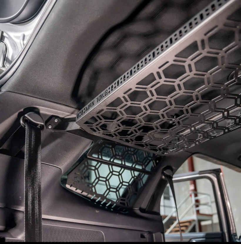 Why you ask? Because not only does the modular system allow you to easily attach various items such as bags, torches and tools, keeping them secure and accessible while driving, the integrated shelf gives you your floor space back, storing larger items up and out of the way. We’ve also added a BONUS feature of integrated rear window molle panels to absolutely maximise every inch of space in the cabin. How good is that!