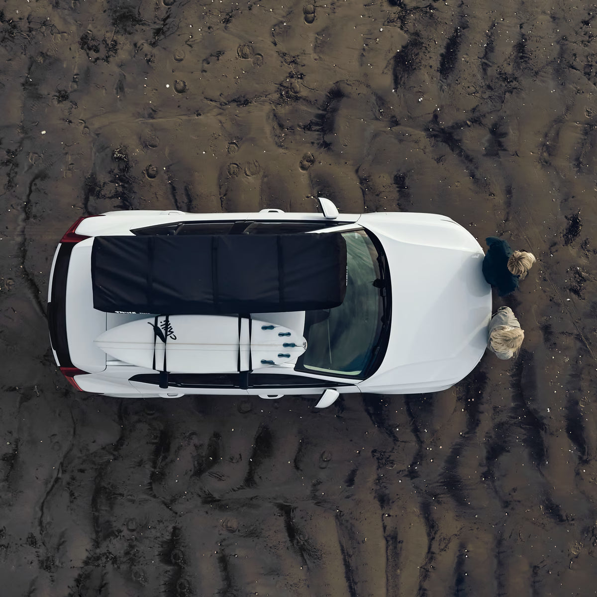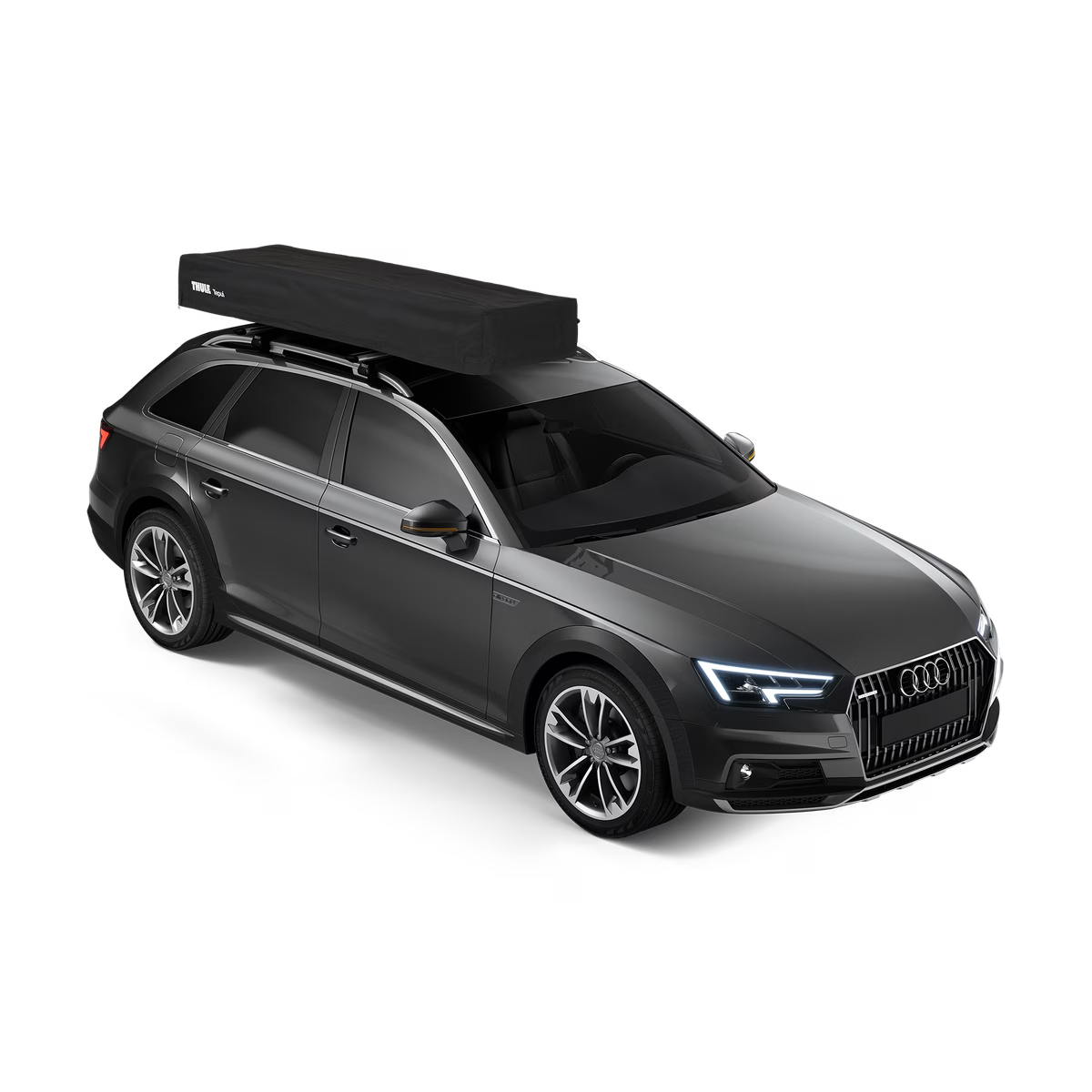 When folded, the Thule Foothill car top tent has a width of just 61 cm, half the size of most rooftop tents on the market. Despite its compact travel size, the deployed tent has just as much interior space as a traditional 2-person tent. To set it up, simply unfold the tent and deploy the telescoping poles. When folded, the tent’s low profile design sits just 24 cm above the roof rack. This creates a more aerodynamic profile and ensures the tent takes up less storage space in a garage in the off season.