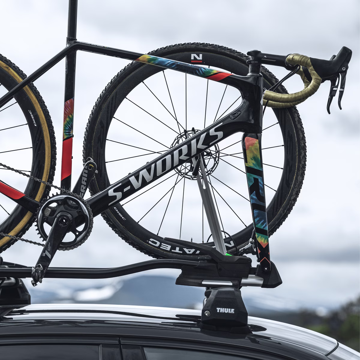 Secure and easy to use roof mounted bike front wheel holder keeps muddy and bulky wheel out of the trunk.